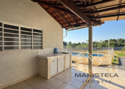 PARTE EXTERNA, ÁREA DE CHURRASCO COM WC, PISCINA, COZINHA COM FOGÃO À LENHA.