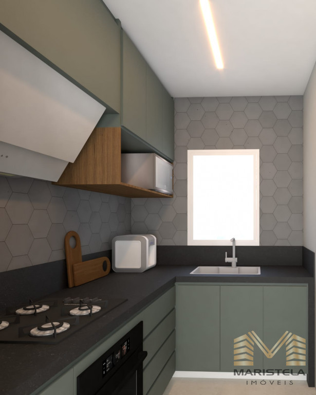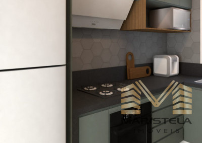 Cozinha com balcão em granito e bancadas em granito,armários planejados,Cooktop,porcelanatos e vitros em blindex.